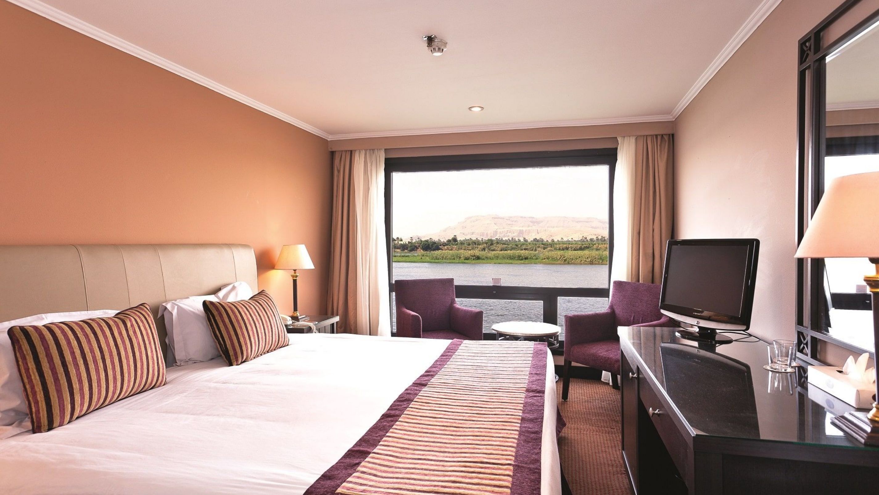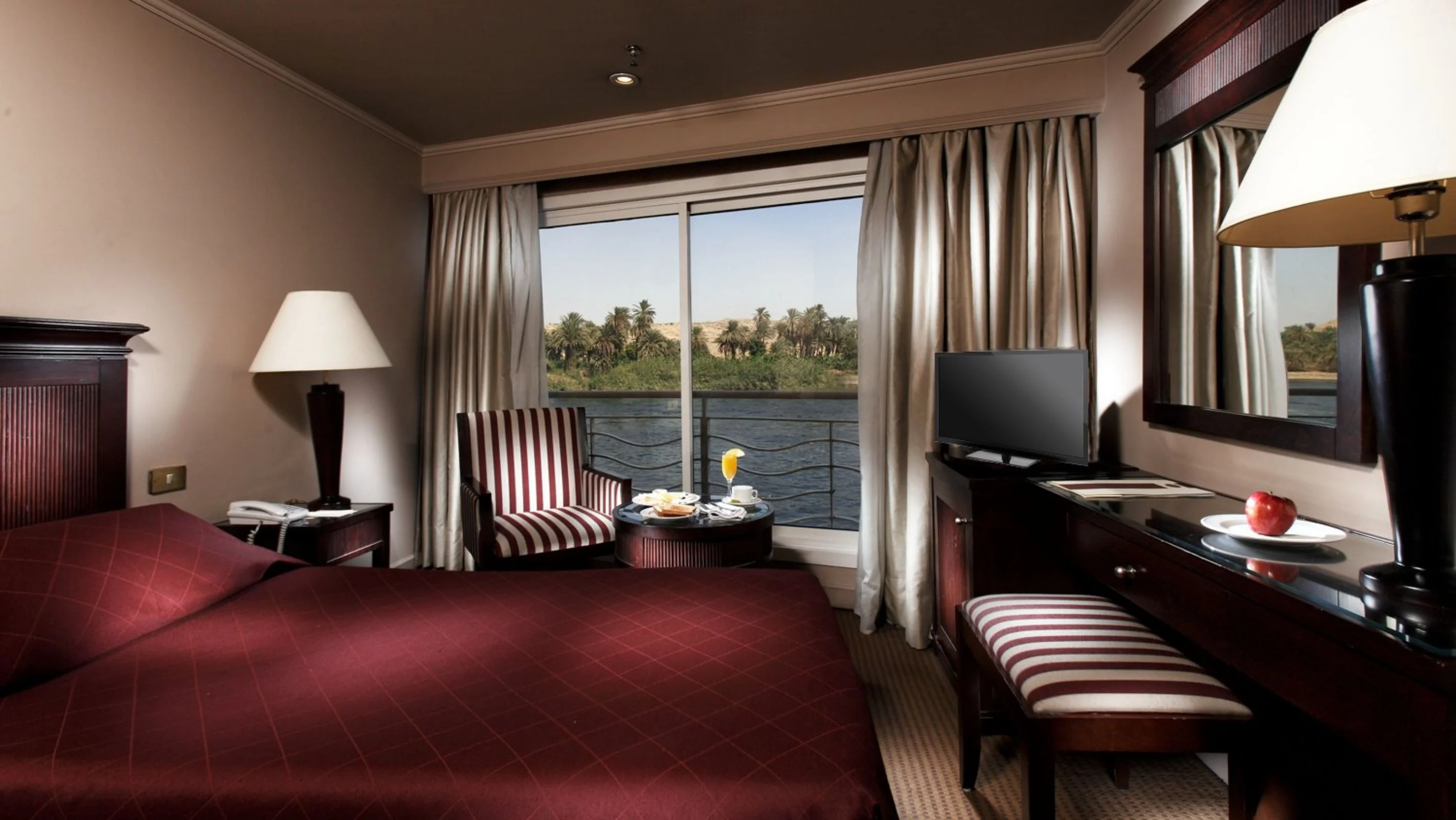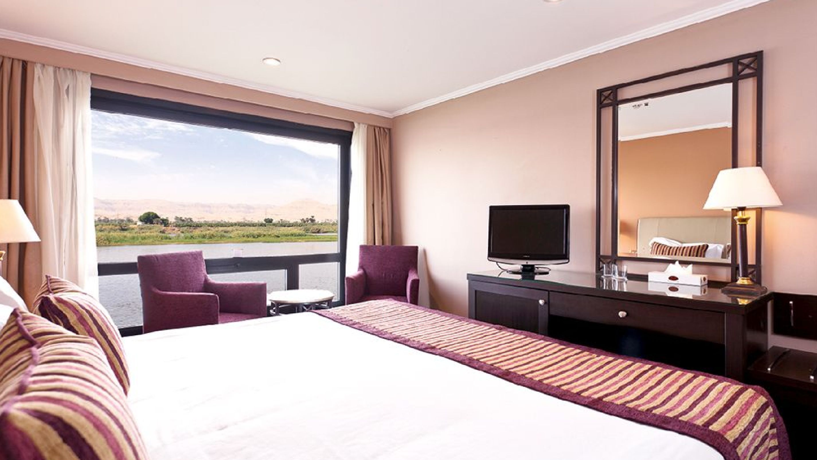 Le navi sul Nilo sono piuttosto strette (circa 11 metri di larghezza), quindi le cabine sono tutte esterne, disposte ai lati di un corridoio centrale e affacciate sul fiume. Dispongono di finestre apribili in stile French balcony.