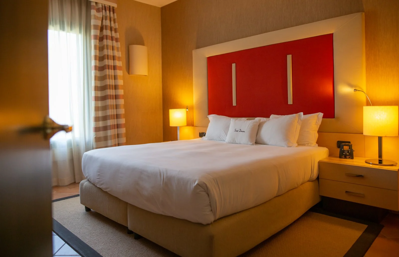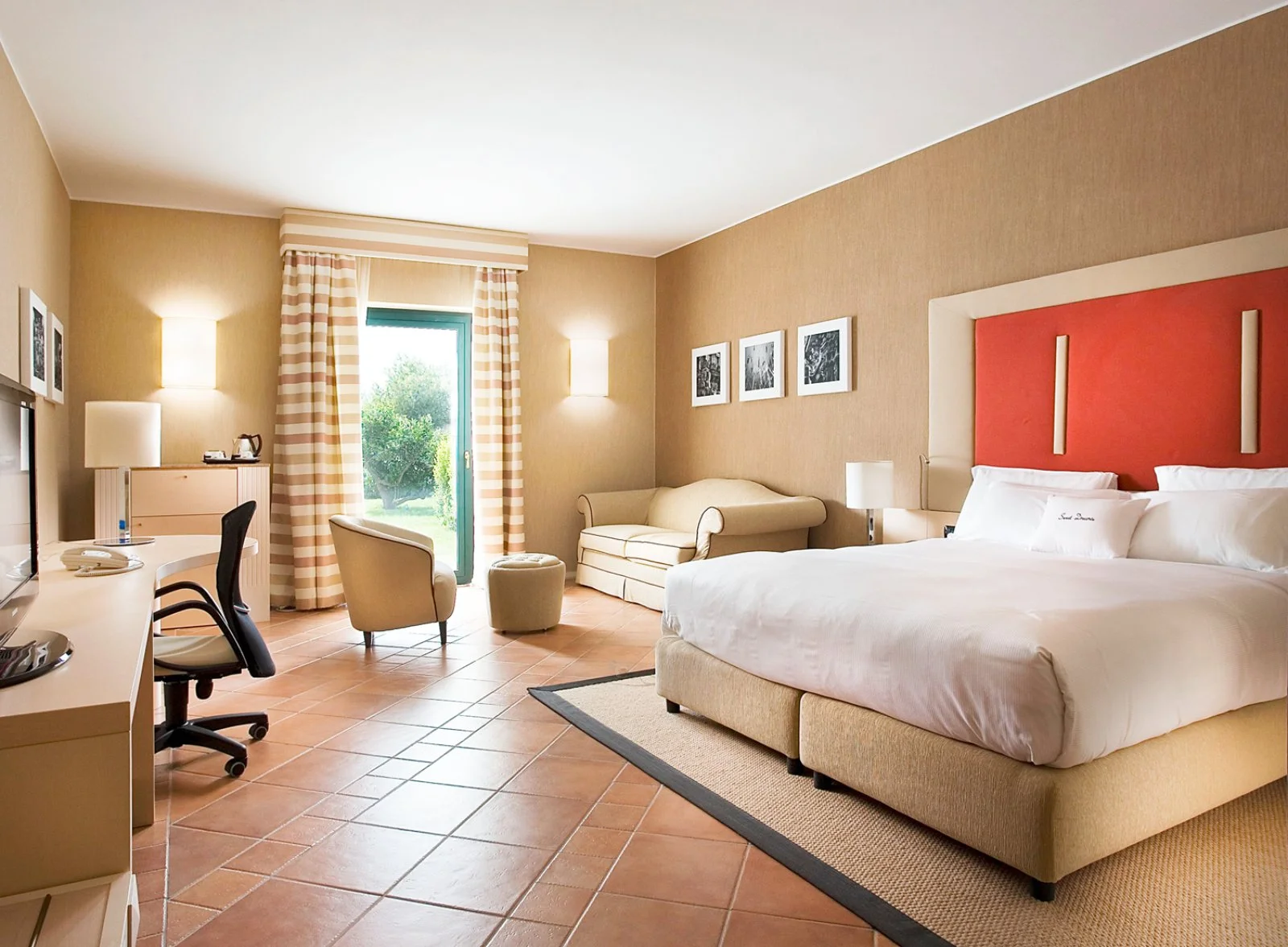 Le Deluxe room di 34m2 possono ospitare massimo 4 persone grazie al sofa letto singolo o doppio, dispongono di TV LCD, Wi-Fi, aria condizionata, cassetta di sicurezza, kit per la preparazione di tè e caffè, ampie finestre e balcone privato con vista sul campo da golf o sui giardini.