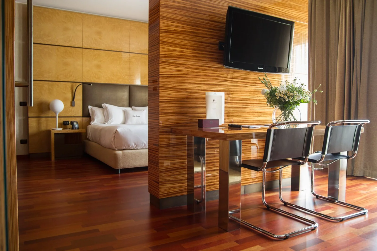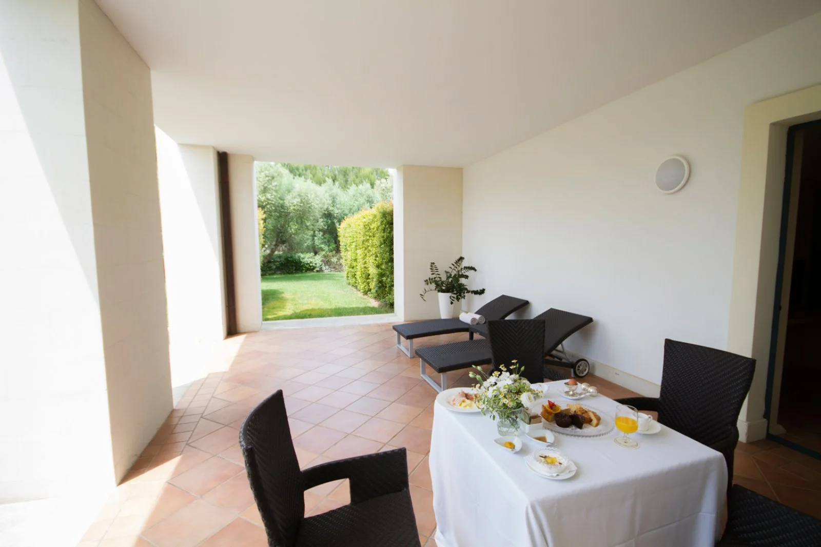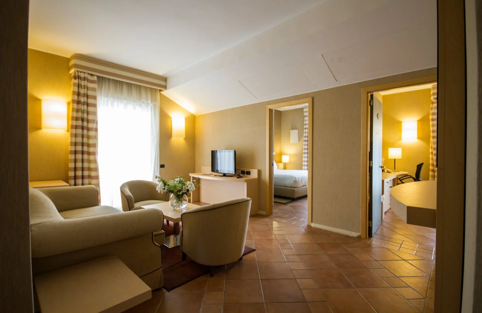 La Suite di 50m2 per massimo 2 persone è situata al secondo piano, con roof garden panoramico e vista sul giardino o sul campo da golf. Sontuoso letto king size, area living separata, spaziosa sala da bagno in marmo, con vasca e doccia separate.Dispone di TV LCD, Wi-Fi, aria condizionata, cassetta di sicurezza, kit per la preparazione di tè e caffè.